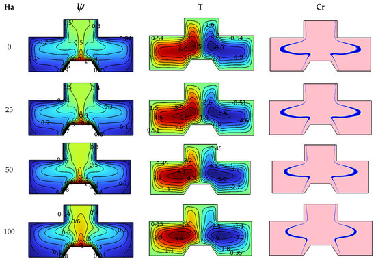In order to understand the impact of the values of Hartmann number (between the values 0 to 100) on the studied system, Figure 4 illustrates this effect of Da = 10−2, Ra = 105 and φ = 4%. The scientific explanation for the influences of the Hartmann number is found by analyzing the contours of isotherms, streamlines and heat capacity (Cr). It is known that the magnetic field creates an electromagnetic force (Lorentz force) that hinders the movement of fluid particles, so we notice a gradual decline in isotherm distribution in terms of the number Ha. The streamlines also show a decrease in the intensity of vorticity by increasing the value of Ha. The contours of heat capacity (Cr) show that the blue lines of physical state change converge as the value of Ha increases because the velocity of the suspension particles decreases in terms of Ha.