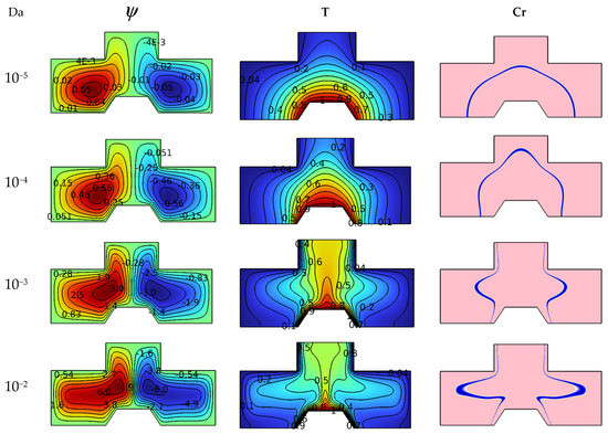 The results of this work also include the effect of the medium permeability on the studied system, so Figure 5 illustrates the influences of the Darcy number (between Da = 10−2 and Da = 10−2) on each of the isotherms, heat capacity and streamlines for Ra = 105, Ha = 0, and φ = 4%. It is known that the permeability of the space is defined in terms of the Darcy number; that is, the higher the value of this number, the greater the permeability. Based on this, the isotherms show an expansion of the dimensionless temperature in terms of Darcy’s number because the suspension movement becomes easier. On the other hand, the streamlines depict an increase in the intensity of the vortices and an increase in their sizes as the value of Da increases. Heat capacity contours are also influenced by the Darcy number because the increase in the speed of the flow expands the blue lines of the regions with the change in the physical state of nano-encapsulated PCM.