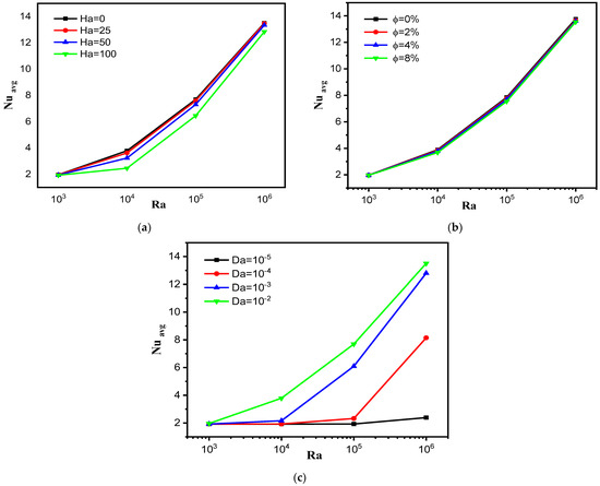The effect of (a) Ha number, (b) nanoparticle volume fraction and (c) Da number on the Nu avg for different values of Ra.