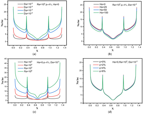Effects of (a) Da number, (b) Ha number, (c) Ra number and (d) nanoparticle volume fraction on the local Nusselt number.