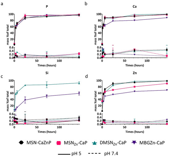 Ion release profiles from MSN-CaZnP (black), MSNZn-CaP (red), DMSNZn-CaP (green) and MBGZn-CaP nanoparticles analysed by ICP-MS; (a) P, (b) Ca, (c) Si and (d) Zn ions release in cacodylate buffer pH 5 (line) and pH 7.4 (dashed line).