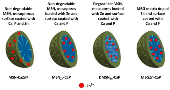 Bone defects caused by trauma, tumor removal and infections are a tremendous burden on western healthcare systems. While autografts remain the gold standard for the treatment of bone defects in patients, issues such as limited availability and complications at the harvest site give rise to the development of synthetic alternatives [1]. Biomaterials such as calcium phosphate ceramics and bioactive glasses are considered promising biomaterials for bone regeneration since they are inherently bioactive and cost-efficient to produce [2,3,4]. Nevertheless, the regenerative capabilities of synthetic biomaterials are considered inferior to natural bone. Doping ceramic biomaterials with bioinorganic ions is an attractive approach to further improve their biological performance since ions are cheap, stable and play vital roles in bone regeneration processes [5,6]. One such example is zinc (Zn), which is an essential trace element found in bones where it plays an important role in bone development, formation and maintenance [7,8]. Lack of Zn is associated with devastating diseases such as osteoporosis, dwarfism and inhibited bone development [9]. In vitro studies have shown that the stimulatory effect of Zn is highly dose-dependent. Specifically, Zn ions applied in the range of 2–5 μg mL−1 can stimulate hMSCs’ adhesion and proliferation, whereas higher Zn doses of 15 μg mL−1 negatively affect osteogenic differentiation and can lead to cell apoptosis [10]. While ion delivery and dose control are important aspects of the therapeutic application of Zn, the same is true for other ions as well. To date, several methods have been explored to allow controlled and localized ion delivery to guide bone regenerative processes while limiting harmful side effects, including the use of nano and microparticles [11,12]. In this regard, mesoporous silica (MSNs) and mesoporous bioactive glass (MBGs) nanoparticles gained interest for use in bone applications as they are inherently bioactive [13]. For example, MBGs are known to promote calcium phosphate mineralization in the presence of high calcium and phosphate-containing buffers. Moreover, their ordered mesoporous structure makes these nanoparticles promising tools for drug delivery purposes in various biomedical fields [14,15].