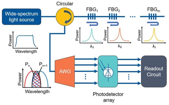 A wide-spectrum light source, circulator, FBG sensors, AWG, photodetector (PD) array, and readout circuit make up the AWG-based FBG interrogation system [21]. The connection is shown in Figure 1. The light signal from the broad-spectrum light source arrives at the FBG through the circulator, the narrow-band Gaussian light of a certain wavelength is reflected by the FBG, and the Gaussian beam enters the AWG through the circulator. The wavelength division multiplexing (WDM) function of AWG enables filtering. A PD is attached after each AWG output channel, from which the optical signal is transformed into an electrical signal. A readout circuit is utilized to process the change in optical power of each AWG output channel. Finally, the interrogation function finds the wavelength change of the optical signal reflected from the FBG and completes the demodulation.