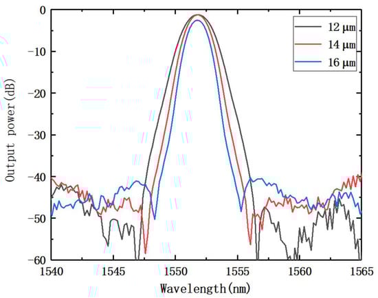 We discuss how the channel bandwidth is impacted by the distance between the adjacent output waveguides and length of the FPR. We completed the relevant simulations using the beam propagation method (BPM) solver in the WDM Phasar (v.2.0; Optiwave Systems Inc. Ottawa, ON, Canada) software, and the basic values were set according to Table 1. The adjacent output waveguide spacings were set to 12, 14, and 16 µm, respectively, and the light intensity data output from channel 19 was processed for the three cases to obtain Figure 3. Figure 3 depicts how the channel bandwidth changes, depending on the distance between adjacent output waveguides. While other parameters are left the same, the channel bandwidth increases as the distance between adjacent output waveguide decrease. Conversely, a reduction in the distance between adjacent output waveguides raises the coupling rate between waveguides, which has an immediate impact on the performance of the AWG and leads to an increase. The distance between adjacent output waveguide values will, thus, have a significant influence on the channel bandwidth.