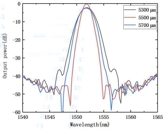 The FPR lengths were set to 5300, 5500, and 5700 µm, and the light intensity data outputs from channel 19 in the three cases were processed to obtain Figure 4. The impacts of various FPR lengths on the channel bandwidth are depicted in Figure 4. With other parameters staying the same, the channel bandwidth rose as the FPR length increased or decreased. At the same time, the AWG’s channel loss increased. As a result, the channel bandwidth was impacted by the change in the FPR length.