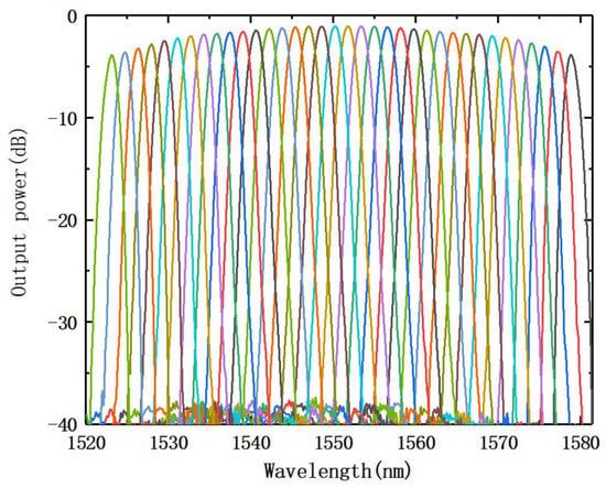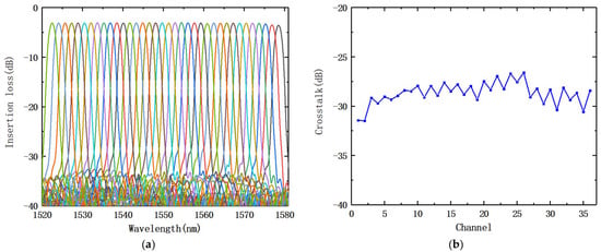 Figure 11a displays the AWG transmission spectrum. Figure 11b shows the non-adjacent channel crosstalk between each channel of the AWG, while Table 2 displays the detailed performance analysis. The findings reveal that our constructed AWG performs reasonably well, and we achieved a large bandwidth transmission spectrum with a good Gaussian shape. The non-adjacent channel crosstalk was −29.76 dB, each channel was less than −25 dB, the insertion loss range was 3.46 dB, and the 3-dB bandwidth of AWG reached 1.76 nm.