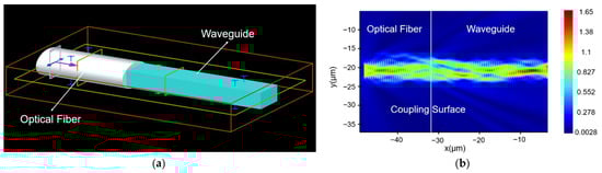 (a) Modeling of fiber-waveguide coupling; (b) optical field distribution of fiber-waveguide coupling.