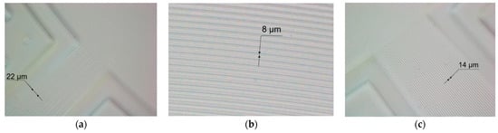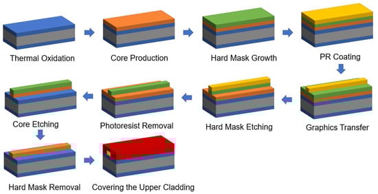 The AWG was fabricated according to the parameters listed previously, and it was manufactured by Henan Shijia Photons Technology Co., Ltd. (Hebi, China). The chip is built on a PLC platform with a 6 µm top Si layer. Figure 7 depicts the fabrication process. The SiO2 lower cladding layer was first produced by wet oxygen oxidation at high temperatures. Plasma-enhanced chemical vapor deposition (PECVD) was used to epitaxially form the core layer, and GeO2 doping was necessary to achieve a refractive index of 0.75 percent throughout the deposition process. After that, the photolithographic pattern was transferred to the wafer using inductively coupled plasma (ICP) dry etching, and the waveguide core layer was etched to form a high-quality waveguide in the core region. Finally, PECVD was used to create a 6 µm thick SiO2 top cladding layer to protect the AWG. Figure 8 shows microscopic images of the fabricated AWG.