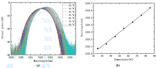 (a) Transmission spectra of channel 1 at different temperatures; (b) relationship between the center wavelength of channel 1 and temperature.