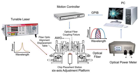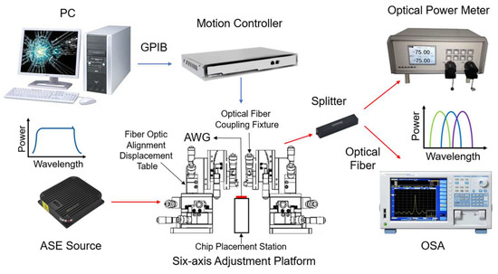 A test setup comprised an amplified spontaneous emission (ASE) wide-spectrum light source, six-axis adjustment platform, splitter, optical spectrum analyzer (OSA), optical power meter, and motion controller, and a PC was constructed to evaluate the performance of the produced AWG (see Figure 10). The ASE wide-spectrum light source was connected to the AWG’s input, and the AWG’s output was connected via a single-mode fiber to a splitter, which was then linked to OSA and an optical power meter. The spectrometer detects the transmission spectrum waveform of the AWG output channel, the optical power meter measures the optical power of the AWG output channel, and the input and output coupling positions are changed by the PC and motion controller.