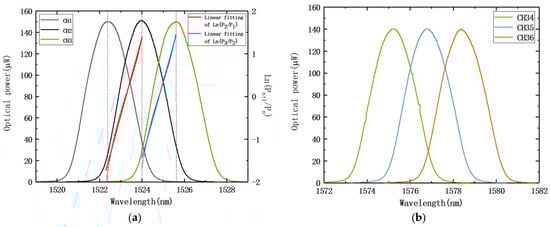 The interrogation findings of the experiment are displayed in Figure 13 and include the output optical power variation values for the AWG channels 1, 2, and 3, as well as channels 34, 35, and 36. Table 3 shows the central wavelengths of AWG channels 1, 2, 3, and 36. Due to the absence of vibration dampening measures on the operating table, some sharper edges appearred in channel 34 in Figure 13b, but this does not affect the conclusion. From the results, the dynamic range achievable by this test system was 1522.4–1578.4 nm. We also evaluated the continuity of interrogation. Figure 13a shows that AWG channels 1 and 2 have a continuous demodulation range of 1522.4–1524.0 nm, while AWG channels 2 and 3 have a continuous demodulation range of 1524.0–1525.6 nm. As a result, from 1522.4–1525.6 nm, AWG channels 1, 2, and 3 can be continuously demodulated. The FBG wavelength derived from the interrogation function was: