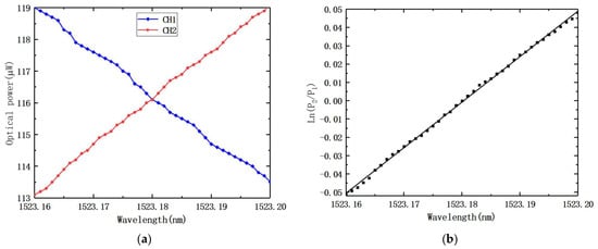 The resolution test of the AWG-based FBG interrogation system: (a) the optical power of adjacent AWG channels; (b) the logarithm of the output optical power ratio of adjacent AWG channels (channels 1 and 2).