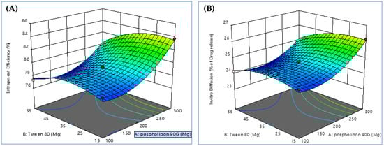 Three-dimensional response surface plot showing the effect of independent variables such as phospholipid concentration (mg) (X1), Tween 80 (mL) (X2), and sonication time (min) (X3) on (A) % entrapment efficiency (Y1) and (B) in vitro diffusion at 6 h (Y2).