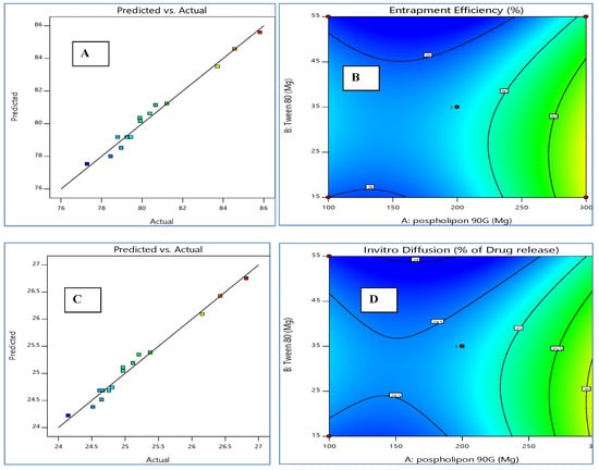 Using a Box–Behnken design, a three-factor, two-level, appropriate statistical tool (Design-Expert DX 11 software), and one-way ANOVA at 0.05 levels, a thorough investigation of the effects of process parameters such as phospholipid concentration (mg) (X1), Tween 80 (mL) (X2), and sonication time (min) (X3) and their interactions was the goal of using the experimental design. Since the Box–Behnken design demands minimum runs compared to a central composite design, it was deliberately chosen [42]. A design matrix was produced by the Design Expert software using data from 15 experimental runs. Table 2 displays the outcomes of the 15 formulations that were formulated. The three-dimensional plots for each of the three responses of Y1 and Y2 are displayed in Figure 2. These diagrams are well known for analyzing the interactions between variables and responses as well as for researching the combined effects of two factors on a response. Figure 3 shows a quantitative comparison between the experimental response values that were obtained and those that were anticipated. Table 3 displays the findings of the regression analysis for the various responses. The interactions’ quadratic nature was confirmed by the higher values of the standard error for the coefficient.