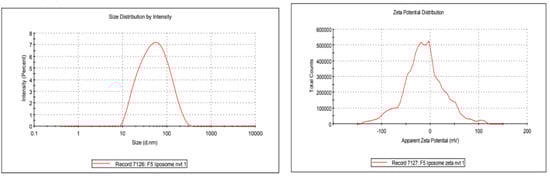 The outcomes demonstrated that OTP dispersion significantly reduces particle size with a restricted size distribution. It was discovered that the OTP’s average particle size was 65 ± 14.44 nm. Figure 4 shows the distribution of vesicle sizes for the optimized formulation. It was discovered that the improved formulation’s zeta potential was −13.0 mv; prior studies had also revealed a value that was very comparable [48]. The value implies the high-level stability of the optimized formulation. Due to the use of Tween 80, these values indicate that the particles have a neutral charge (a non-ionic surfactant). Tween 80, a surface stearic stabilizer, is used to cover the surface of nanoparticles to stop them from aggregating. The formulation would be stable as a result.