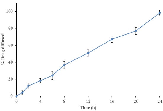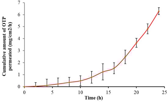 Franz diffusion cells were used to test the ex vivo skin permeation of the designed OTP, utilizing excised pig skin as the permeation membrane. Over the course of 24 h, it was discovered that these transferosomal gels’ ex vivo skin penetration of OTP was sustained (Figure 9). These transferosomal gels’ Jss (mg/cm2/h) was calculated to be 0.123 ± 0.0067 mg/cm2/h. Therefore, the Jss of the transferosomal gel increased as the PEE in transferosomes containing PAC increased. This agreed with earlier studies that found that the transdermal penetration of medication when the deformable vesicles were applied topically was ten times higher than that of conventional vesicles [50]. Deformable vesicles containing sodium deoxycholate may have caused the change in water concentration. It has also been shown that the inclusion of surfactants in the phospholipid vesicles promotes the production of membrane ripples. These ripples also provide the inter-membrane connection location for membrane fusion [37].