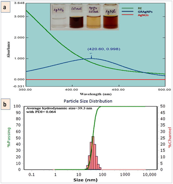 The biosynthesis of GRAgNPs was ascertained by the visual color transition of the mixture of RE and AgNO3 from light yellow to colloidal brown. Figure 1a illustrates the color change due to biotransformation of Ag+ ions to Ag0 leading to the synthesis of GRAgNPs. GRAgNPs exhibited a strong surface plasmon resonance (SPR) peak at 420.60 nm with absorbance 0.998 while RE and AgNO3 did not exhibit any peaks. The size and spherical shape were confirmed by the SPR peak at a lower wavelength, which is in agreement with previous studies on the synthesis of GRAgNPs where spherical NPs of size 5–46 nm were found to be having SPR peaks from 404 to 445 nm [31,32,33,34]. High absorbance (~1) pointing towards the higher concentration of synthesized GRAgNPs in terms of their number [10].