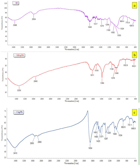 The HRTEM images of GRAgNPs showed that NPs are almost spherical in shape with uniform size distribution (Figure 2b, panel (i)). The clear and similar lattice spacing (d-spacing) between atomic planes was observed as 2.34 Å (Figure 2b, panel (ii)). The polycrystalline nature of spherical NPs was confirmed by the clear and uniform concentric rings as shown in Selected Area (Electron) Diffraction (SAED) pattern (Figure 2b, panel (iii)). The mean particle size obtained was 20.017 ± 6.79 with a range of 9.61–34.735 nm. HRTEM size was found to be in concurrence with prior reports on green synthesis of GRAgNPs exhibiting size distribution of 20–30 nm [31], 7–45 nm [32], 10–45 nm [33] and 46 nm [34]. The obtained lattice spacing distance is in agreement with the published value of miller indices (h k l) of (1 1 1) d-spacing of face-centered cubic (FCC) silver [35]. The FTIR spectral analysis of GRAgNPs depicted that the biomolecules present in RE lead to the shifting in various peaks due to the interaction of their functional groups within the synthesized NPs. The FTIR profile of RE showed various peaks at 3368, 2934, 1648, 1517, 1374, 1244, 1160, 1082, 1055, 1024, 864.4, 775.4, 626.5 cm−1, whereas the GRAgNPs showed spectral bands at following positions 3330, 2940, 1611, 1516, 1384, 1156, 1076, 1046, 832.6, 632.8 cm−1 (Figure 3a,b). In addition, the FTIR profile of CAgNPs showed various peaks at 3410, 2950, 2880, 1654, 1491, 1460, 1420, 1371, 1287, 1220, 1084, 1034, 882.6, 731.1, 646.9 cm−1, which were in concurrence with those exhibited by polyvinylpyrrolidone (PVP) coated CAgNPs dispersed in ethylene glycol [36,37] (Figure 3c).