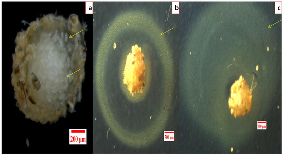 Effect of silver nanoparticles synthesized using aqueous root extract of G. glabra (GRAgNPs) on hatching inhibition in M. incognita, (a) healthy egg mass, (b) GRAgNPs treated egg mass after 24 h, (c) after 48 h of the treatment.