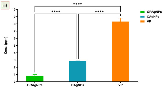It was evident from the data that mortality rate was dependent upon the type of treatment, concentration, and exposure time. No nematicidal activity of RE was observed, whereas 100 % mortality was recorded at the lowest dose of 6.0 ppm, and 10.0 ppm in case of GRAgNPs, and CAgNPs, respectively, after 12 h of treatment. The commercial nematicide (VP) caused 98.0 % mortality at a relatively very high concentration of 75.0 ppm (Figure 5, panel (i)). It was observed that on increasing exposure time of treatment from 12 h to 24 h, 100% mortality was achieved at relatively lower concentrations. After 24 h, GRAgNPs exhibited a relatively very high mortality of 98.83%, 99.67% and 100% at 0.5 ppm, 1.0 ppm, and 2.0 ppm, respectively, whereas VP and CAgNPs did not exhibit any mortality at 0.5 ppm (Figure 5, panel (ii)). In contrast to GRAgNPs, VP and CAgNPs showed very little mortality, 1.33%, and 3.17% at 1.0 ppm, and 10.83%, and 57.0% at 2.0 ppm, respectively (Table S3 in the Supplementary Materials). After 12 h doses from 0.5 to 6.0 ppm were used to calculate LC-50 for GRAgNPs, CAgNPs and VP. LC-50 for GRAgNPs, CAgNPs and VP was found to be 0.805 ± 0.177, 2.849 ± 0.032, 8.325 ± 0.473 ppm, respectively (Figure 5, panel (iii)). GRAgNPs were observed to be the most efficient at 0.805 ppm to kill 50.0% of J2s, which is approximately 1/3rd of LC-50 of CAgNPs, and 1/10th of VP. The ordinary one-way ANOVA with Turkey’s multiple comparisons test showed statistically significant difference in median LC-50 doses in accordance with the treatment type, where F (2, 15) = 1061, p < 0.0001, R2 = 0.9930 at 95% confidence interval and α = 0.05 were observed (Figure 5, panel (iii)).