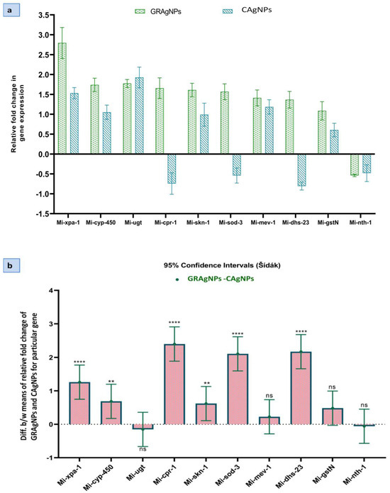 The ordinary two-way ANOVA showed that the Dosage x Relative fold change in gene expression interaction accounted for 19.55% of total variance, whereas dosage for 22.68% and relative fold change in gene expression for 54.92% at p < 0.0001 and α = 0.05 and the effects were considered extremely significant. The Šídák’s multiple comparisons post hoc test compared the means of both GRAgNPs and CAgNPs on the expression of a particular gene at 95% CI and α = 0.05 (Figure 7b). Moreover, 95% CI of difference was found to be extremely significant for xpa-1, cpr-1, sod-3, and dhs-23, highly significant for skn-1 and cyp-450, and non-significant for mev-1, gst-n, ugt and nth-1. All these differences of treatment means are large enough to be scientifically relevant.