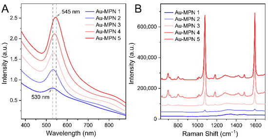 (A) UV-VIS absorbance spectra of Au-MPNs with different Au/MPN ratios and (B) their corresponding SERS activities to 4-MBA.