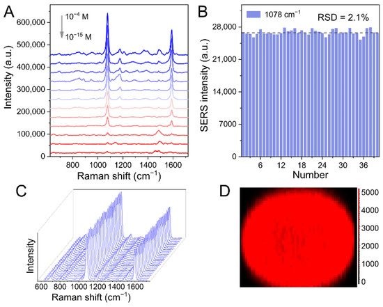 Then, different concentrations of 4-MBA molecules were deposited onto Au-MPN-4 for SERS detection. As shown in Figure 3A, the concentration-dependent SERS signals are observed at the concentration range of 4-MBA from 10−15 to 10−4 M. The SERS spectral pattern retains well though some peaks disappear at low 4-MBA concentrations. The major bands at 1078 and 1596 cm−1 assigned to the ring-breathing modes always exist, even if the concentration of 4-MBA decreases down to 10−15 M. To estimate the SERS repeatability, more than 40 SERS spectral lines of 4-MBA after grafting onto Au-MPN were collected (Figure 3C); and the SERS intensity of the Raman band at 1078 cm−1 was shown in Figure 3B, in which the RSD value was calculated to be 2.1%, indicating a good SERS reproducibility. We also plotted a SERS map of Au-MPN/4-MBA after drying, further confirming the SERS’ good uniformity (Figure 3D).