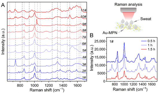 (A) SERS spectra of sweat samples collected from eleven volunteers (1#–8#, men; 9#–11#, women) using Au-MPN as the ultrasensitive optical sensor. (B) Time-resolved SERS spectra of sweat for volunteer 1# after exercise.