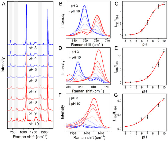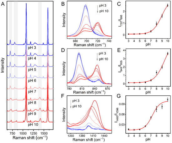 SERS spectra of Au-MPN/4-MBA in simulated sweats (A) with different pH values. Enlarged SERS spectra at the wavenumber ranges of 665–745 cm−1 (B), 775–880 cm−1 (D) and 1340–1460 cm−1 (F), respectively. SERS intensity ratios of 722/698 (C), 845/805 (E) and 1400/1596 (G) as a function of pH, respectively.