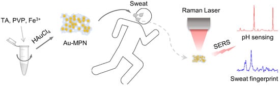 Herein, a simple strategy for the SERS sensor is proposed by in situ rapid generations of Au NPs on MPN (Scheme 1). The as-prepared Au-MPN displays a film-like structure with densely scattered Au NPs, which generates abundant “hot spots”, achieving excellent SERS activity with the limit of detection (LOD) to 10−15 M for 4-mercaptobenzoic acid (4-MBA). The general surface binding affinity of MPN shows the great convenience of the nanocomposites to fabricate versatile SERS platforms. Au-MPN is then used as an ultrasensitive SERS substrate for the detection of the biochemical components of sweat samples acquired from a volunteer after exercise. In addition, a pH nanoprobe based on Au-MPN is established to monitor the electrolyte metabolism of the volunteer.