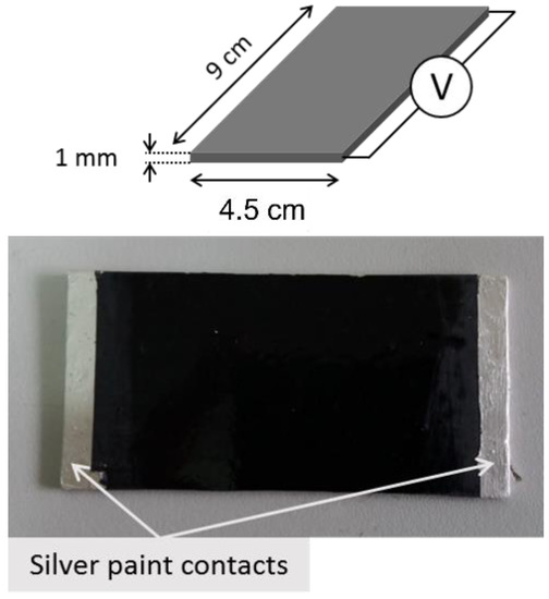 Heating tests were conducted at room temperature (25 °C) by applying a constant voltage of 12 or 24 V DC and continuously recording the material temperature vs. time profile. A data acquisition board (Thermocouple Data Logger, supplied by Pico Technology, St Neots, UK) was used to acquire the thermocouple measurements. In order to record the local temperature evolution, dedicated LabView software was developed. The temperatures were measured using thin wire thermocouples (Type K Omega Engineering Ltd., Manchester, UK) with negligible thermal inertia, which were positioned at the centre of the sample. The laboratory power supply was an EA-PSI 8360-10T (Elektro-Automatik, 0–360 V, 0–10 A, 1000 W max), which was connected to the sample as described in Figure 2.