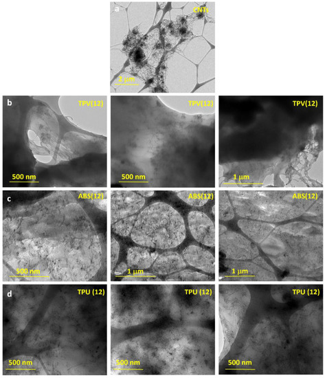 TEM micrographs of samples: (a) CNTs; (b) TPV(12) nanocomposite; (c) ABS(12) nanocomposite; (d) TPU(12) nanocomposite.