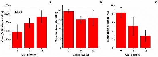 (a) Young’s modulus, (b) tensile strength, and (c) strain at break of ABS nano-composites.