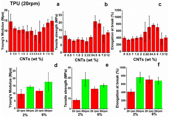 (a) Young’s modulus, (b) tensile strength, and (c) strain at break of TPU nanocomposites; (d–f) tensile parameters at different values of speed rotation (rpm) during the mixing step.