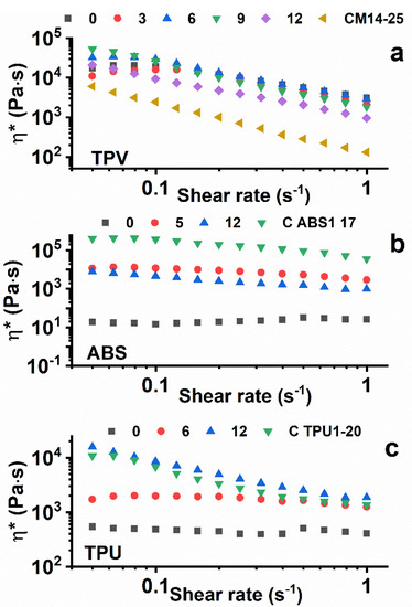 Figure 7 shows the viscosity vs. the shear rate for the three analyzed samples, TPV(x) (Figure 7a), ABS(x) (Figure 7b), and TPU(x) (Figure 7c), at different loadings of MWCNTs.