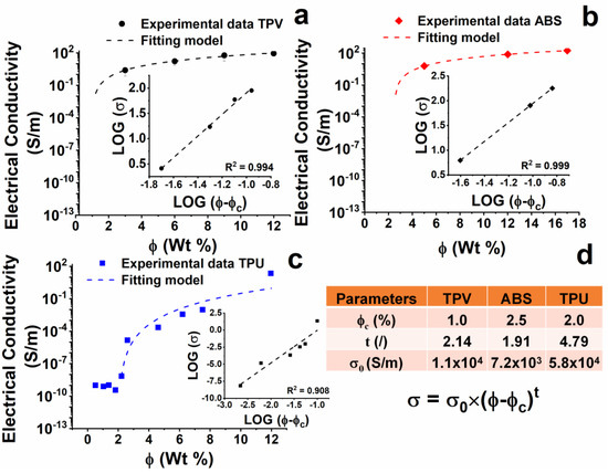 Electrical conductivity of produced nano-composites and results of percolative theory applied to the experimental dataset of the samples: (a) TPV(x); (b) ABS(x); (c) TPU(x); (d) Fitting parameters of the percolative theory.