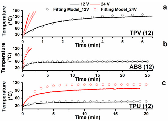 Figure 10 shows the experimental curves (continuous curves) of temperature vs. time recorded during the heating test starting from room temperature (25 °C) together with the behaviour of the curves obtained applying the developed model (empty circles). The heating tests were performed considering the samples for which the highest value of DC conductivity was detected. In particular, samples TPV(12), ABS(12), and TPU(12) were tested.