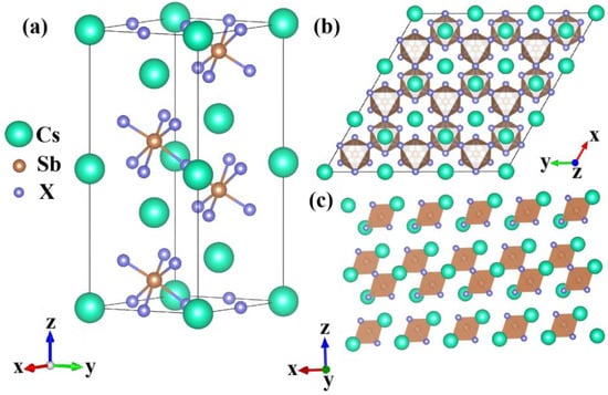 (a) Optimized structure of Cs3Sb2X9; (b) corresponding crystal structure of Cs3Sb2X9 viewed in the xy plane; (c) layered form Cs3Sb2X9.