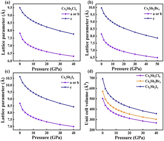 Calculated lattice parameter a, b and c of Cs3Sb2Cl9 (a); Cs3Sb2Br9 (b); Cs3Sb2I9 (c); as a function of pressure: (d) lattice volume of Cs3Sb2X9 with increasing pressure from 0 to 40 GPa.