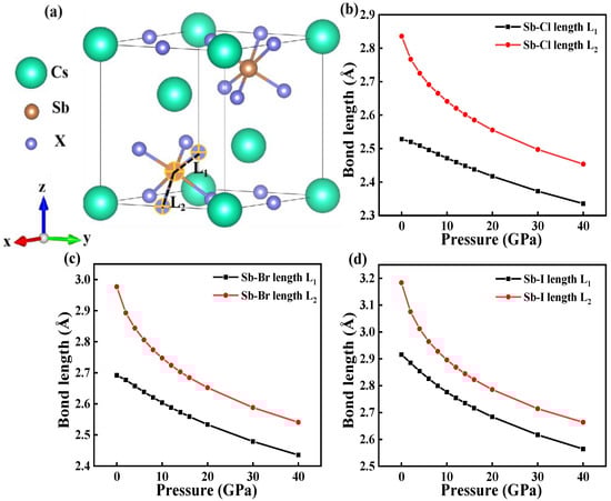 To explain the shrinking bandgap and lattice constant of the Cs3Sb2X9 under pressure, we also calculated the relation between the bond length and the pressure. As shown in Figure 4a, two different bond lengths, L1 and L2, are defined as the short and long Sb-X bonds, respectively. The bond lengths were obtained using the VESTA. Figure 4b–d presented bond length as a function of pressure for Cs3Sb2X9. The bond lengths of Cs3Sb2Cl9, Cs3Sb2Br9 and Cs3Sb2I9 increase in order without pressure, which can be explained by the increase in the atomic radius of halogen atoms [28]. Both short and long Sb-X bond lengths decrease with pressure, indicating that Cs3Sb2X9 are compressed under the pressure. The variation range in short bond L1 of the Cs3Sb2X9 is 2.53–2.34, 2.69–2.44 and 2.92–2.56 Å, respectively. The long bond L2 varies in the range of 2.84–2.45, 2.98–2.54 and 3.18–2.66 Å, respectively. The theoretically calculated bond lengths of Cs3Sb2X9 under the pressure from 0–40 GPa are shown in Supplementary Materials Table S5. The previous work also showed that the electronic structure of Cs3Sb2X9 was strongly affected by the Sb-X bond length [19,38]. In addition, L1 and L2 rapidly decrease at first and then slowly, which means that the increasing proximity of adjacent [Sb2X9]3− polyhedra leads to electrostatic interactions becoming strong under high pressure [19]. As the pressure increases, the Sb and X orbitals gradually overlap, and the electronic band dispersion increases as the Sb-X bond contracts. As a result, the CBM gradually decreases towards the Fermi energy level, and the VBM starts to rise simultaneously [17]. As a result, the narrowing of the bandgap at high pressure is presented. Combined with the above analysis, the reduction in bond length leads to a shrinkage in the lattice constant and further reduces the bandgap.