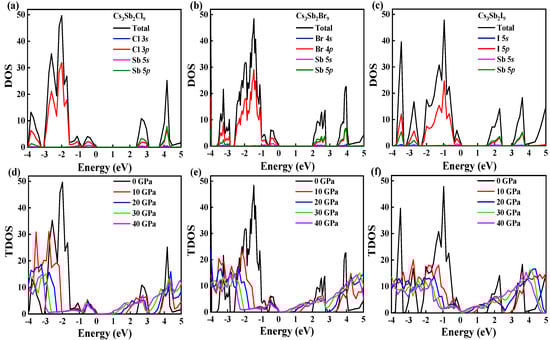 The density of states (DOS) represents the number of electrons in the unit energy range. Much information can be obtained from a DOS diagram, such as VBM, CBM and the contribution of each orbital to the total density of states. Therefore, we calculated DOS of Cs3Sb2X9 with and without pressure to help us further understand the band structures. Here, the electronic configurations of 5s25p66s for Cs, 5s25p3 for Sb, 3s23p5 for Cl, 4s24p5 for Br and 5s25p5 for I are considered as valence electrons. As shown in Figure 5a–c, the partial density of states (DOS) indicates that the VBM of the Cs3Sb2X9 mainly originates from Sb-5s and X-p, while the CBM is dominated by both Sb-5p and X-p. DFT analysis indicates that these results are consistent with the previous reports [28]. Figure 5d-f showed the total density of states under different pressures. As the pressure increases, both VBM and CBM move towards the Fermi energy level and eventually overlap (for Cs3Sb2Br9 and Cs3Sb2I9). When the valence and conduction bands become overlapped, the material changes from semiconductor to metal, which is consistent with the previous work [39]. Additionally, according to Figure 2a–d, the conduction band dropped by 1.71 eV and the valence band rose by 0.386 eV for Cs3Sb2I9. Thus, the conduction band plays a major role in the narrowing of the bandgap. The electrons that make up the conduction band are mainly provided by Sb-5p and X-p and the strong anti-bonding interaction between the two electrons [17].
