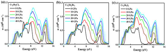 The high pressure influences the band structure, bandgap energy and the nature of the bonding of the band structure; these changes will further influence the optical absorption of Cs3Sb2X9. Figure 6a–c showed the absorption spectra of Cs3Sb2X9 as a function of photon energy at different pressures. One can see that the absorption edge shifts towards lower energies (redshift) with increasing the pressure, which is consistent with the variation of the bandgap under the pressure shown in Figure 2. The redshift of the absorption edge for CsSnCl3 with increasing pressure was also mentioned in a previous report by Jakiul Islam et al. [37]. Supplementary Materials Figure S3 showed the optical properties calculated using the HSE06 hybrid exchange-correlation function and employing a dense 5 × 5 × 5 k-point grid. The same variation trend is obtained for both PBE and HSE06. As the pressure increases, the gap between the conduction band and the valence band decreases or even overlaps, which facilitates the transport of carriers and thus enhances light absorption. In Figure 6a, the absorption peaks of Cs3Sb2Cl9 are concentrated in the ultraviolet region and can theoretically be used as an alternative material for sterilizing surgical equipment [41], whereas in Figure 6c, the absorption spectra of Cs3Sb2I9 fully covered the visible region and can be used in the field of solar cells [42].