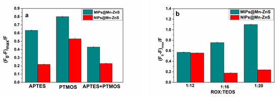The binding capacity of MIPs@Mn-ZnS QDs to ROX was mainly dependent on the amount of recognition sites in the MIP layer. In order to find the best proportion of polymerization for MIPs@Mn-ZnS QDs, the type of functional monomer, the ratio of template to cross-linking agent were investigated. On the basis of the structure characteristics of ROX, the functional monomers which could better match with target molecules were explored. In this study, APTES-modified Mn-ZnS QDs could offer binding sites to react with hydroxyl and arsonic acid groups of the template. PTMOS, APTES and the mixture of APTES and PTMOS (1:1, n/n) were chosen as functional monomers, respectively. The binding ability of the corresponding polymers was investigated by the quenching efficiency of MIPs@Mn-ZnS QDs. As shown in Figure 2a, when PTMOS was chosen as the functional monomer, the fluorescence quenching efficiency was the best compared with APTES or the mixture of APTES and PTMOS. This might result from the multi-interactions existing in the matrix of APTES@Mn-ZnS QDs, target molecule and monomer. The amine groups modified on APTES@Mn-ZnS QDs could provide hydrogen bonds with oxygen atoms and bind with arsenic acid through the acid-based interaction [40], while PTMOS provided phenyl to react with the phenyl residue of ROX through π–π conjugation. Theoretically, bifunctional monomers can provide more interactions, but they also cause considerable steric hindrance, which is not conducive to the formation of imprinted sites. Thus, in the following experiments, PTMOS was chosen as the monomer.