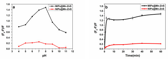 The fluorescent intensity of MIPs@Mn-ZnS QDs towards ROX molecules in aqueous media depends on a variety of interactions. For example, hydrogen binding, ionic interactions and hydrophobic effects. The influence of pH on the quenching ability of MIP@Mn-ZnS QDs towards ROX was investigated. The quenching ratio of the MIP@Mn-ZnS QDs in the pH range from 4 to 11 was investigated. As shown in Figure 5a. The fluorescence quenching ratio of the MIP@Mn-ZnS QDs to ROX was increased with pH from 4 to 8 and then decreased from 8 to 11. The phenomenon could be explained as follows: There were many amino groups in the MIP layer, and so the low response of the MIPs@Mn-ZnS QDs to ROX at low pH values was probably related to the protonation of amino groups. When pH was high, the hydroxyl anion would create a surface defect to damage the structure of the cavities because the imprinting layer could be ionized in alkaline environment [41], which would weaken the interaction between the MIPs and ROX. There were no special binding sites on the NIP@Mn-ZnS QDs, thus the influence of pH on the NIP@Mn-ZnS was little. On the whole, the pH of 7 was chosen for the subsequent experiment.