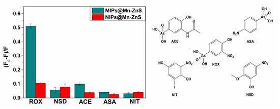 The selectivity of the MIPs@Mn-ZnS QDs for ROX was tested by competitive experiments. The structure analogues ASA, NSD, ACA and NIT, which were structurally related with the target molecule ROX, were chosen for evaluating the fluorescence quenching of MIPs@Mn-ZnS and NIPs@Mn-ZnS QDs in the same concentration (0.5 μM). The fluorescence quenching ratios of MIPs@Mn-ZnS and NIPs@Mn-ZnS QDs in the presence of ROX, ASA, NSD, ACA and NIT are displayed in Figure 8. The fluorescence quenching ratios of MIPs@Mn-ZnS QDs to ROX were much higher than those of the analogues, but the NIPs@Mn-ZnS did not exhibit significant difference to ROX and the analogues. The reason might be due to the tailor-made recognition sites which matched with the template in size, shape and space. It could be supposed that the electron-accepting character of the nitro group in the roxarsone affects the acidity of the compound. The higher acidity of roxarsone (because of the presence of the nitro group in meta position) with respect to acetamido group in ACE could be responsible for higher specificity due to electrostatic interactions with the amine group in the polymer network. This was also why 4-amino-derivative ASA, which was characterized by significantly lower acidity when compared with roxarsone, was characterized by low specificity [44,45].