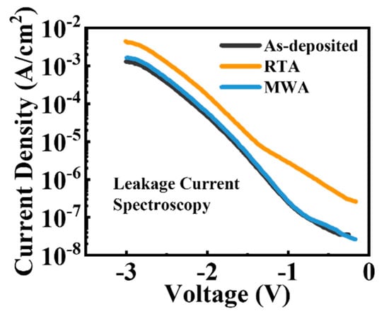 - Shih, T.-L.; Su, Y.-H.; Kuo, T.-C.; Lee, W.-H.; Current, M.I. Effect of Microwave Annealing on Electrical Characteristics of TiN/Al/TiN/HfO2/Si MOS Capacitors. Appl. Phys. Lett. 2017, 111, 012101. [Google Scholar] [CrossRef]