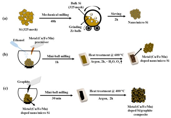 The schematic of the three-step preparation process of the metal (Cu/Fe/Mn)-doped Si/graphite composite is shown in Figure 1. The bulk Si (325 mesh) was taken into a ball mill with zirconium balls, and milling was carried out for 48 h, where bulk Si particles were crushed into nano/micro particles, as shown in Figure 1a. In the next step, the prepared nano/micro Si particles were thoroughly mixed with the desired amount of metal (Cu/Fe/Mn) nitrate precursor and ethanol solvent by using a mini-mill for 1 h. The obtained uniform slurry contains dissociated metal (Cu/Fe/Mn) and nitrate ions together with silicon particles and was transferred into an alumina crucible of a tubular furnace and subjected to thermal annealing at 600 °C for 2 h in an argon atmosphere. This process allows the successful metal (Cu/Fe/Mn) doping with minute nitrogen, while the excess amounts of solvent, water, and oxygen were excluded from the sample and giving metal (Cu/Fe/Mn)-doped nano/micro Si particles, as shown in Figure 1b. As shown in Figure 1c, metal (Cu/Fe/Mn)-doped nano/micro Si particles were mixed with graphite powder by using a mini-mill for 30 min to make a uniform mixture. Then, the mixture was taken into an alumina crucible and heat-treated at 400 °C for 2 h in argon. When the furnace was cooled to room temperature, the samples were collected and named SiCuG, SiFeG, and SiMnG, referring to their metal dopants.