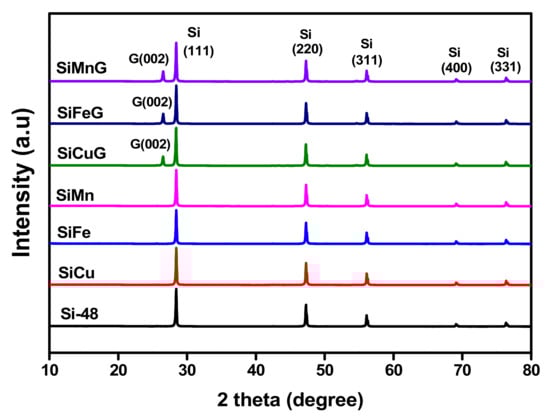 XRD patterns of Si-48, SiCu, SiFe, SiMn, SiCuG, SiFeG, and SiMnG materials.