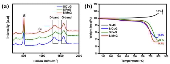 (a) Raman spectra of SiCuG, SiFeG, and SiMnG. (b) TGA results of Si-48, SiCuG, SiFeG, and SiMnG.