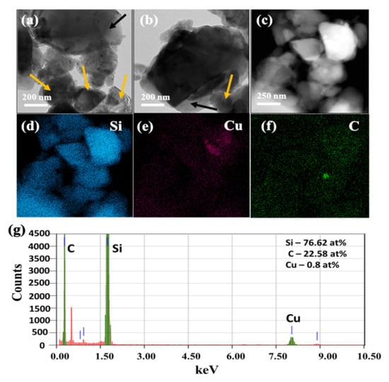 (a–c) TEM images, where yellow arrows represent Si particles and black arrows indicate graphite; (d–f) corresponding EDX elemental mapping of Si, Cu, and C of (c); (g) TEM-EDX spectra of SiCuG, where green colored lines indicate C, Si and Cu (from left to right), and red colored lines indicate Copper (Cu) from the TEM sample grid.